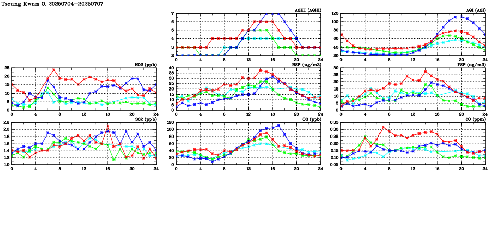 | Air Quality Data Time Series in Tseung Kwan O (2025/07/07) | ( Line colors: Day -3 Day -2 Day -1 Current day ) | 2D Map Current AQHI |