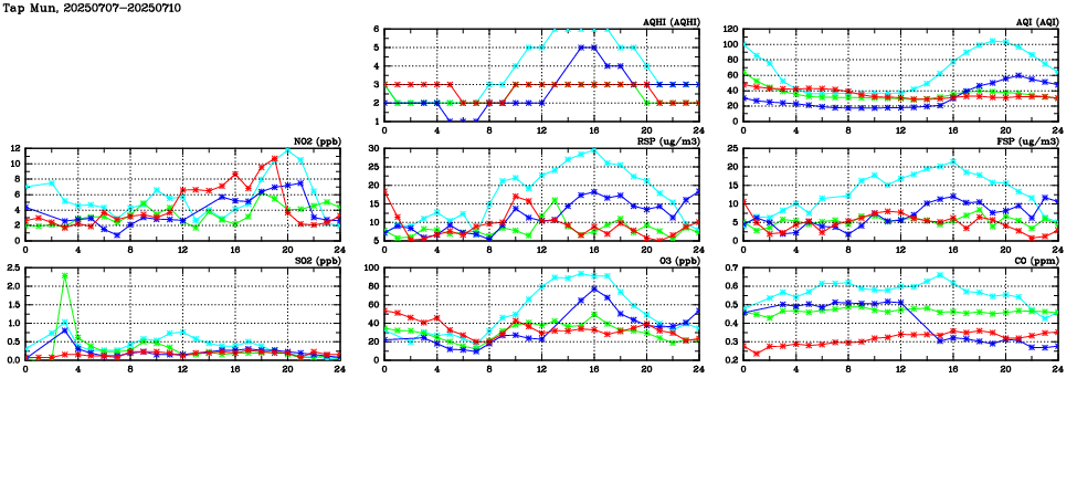 | Air Quality Data Time Series in Tap Mun (2025/07/10) | ( Line colors: Day -3 Day -2 Day -1 Current day ) | 2D Map Current AQHI |