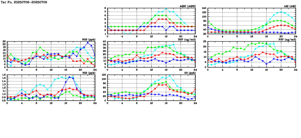 | Air Quality Data Time Series in Tai Po (2025/07/09) | ( Line colors: Day -3 Day -2 Day -1 Current day ) | 2D Map Current AQHI |