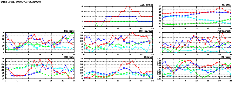 | Air Quality Data Time Series in Tuen Mun (2025/07/04) | ( Line colors: Day -3 Day -2 Day -1 Current day ) | 2D Map Current AQHI |