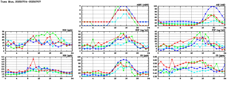 | Air Quality Data Time Series in Tuen Mun (2025/07/07) | ( Line colors: Day -3 Day -2 Day -1 Current day ) | 2D Map Current AQHI |