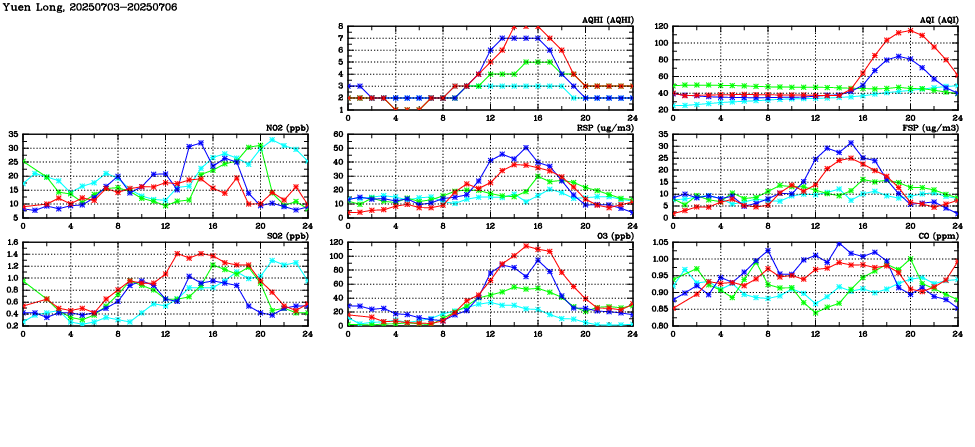 | Air Quality Data Time Series in Yuen Long (2025/07/06) | ( Line colors: Day -3 Day -2 Day -1 Current day ) | 2D Map Current AQHI |