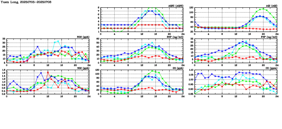 | Air Quality Data Time Series in Yuen Long (2025/07/08) | ( Line colors: Day -3 Day -2 Day -1 Current day ) | 2D Map Current AQHI |