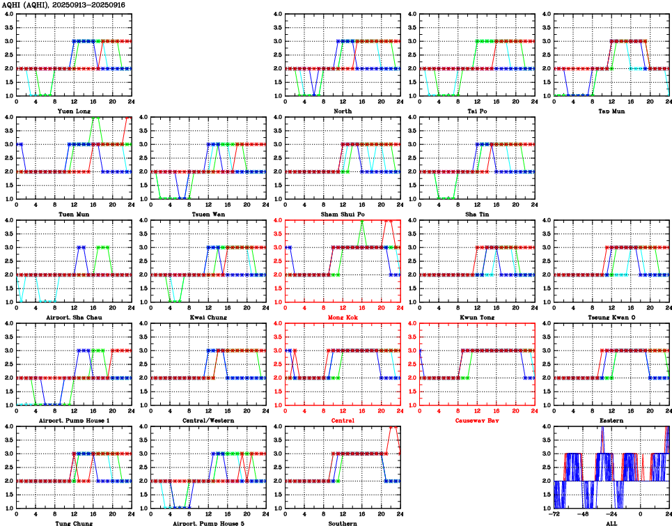 Air Quality Data Time Series for AQHI (2025/09/16) ( Line colors: Day -3 Day -2 Day -1 Current day ) 2D Map   Current AQHI