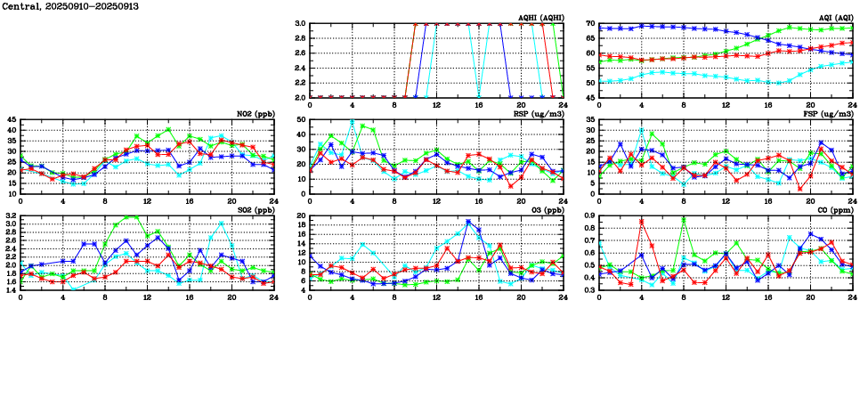 Air Quality Data Time Series in Central (2025/09/13) | ( Line colors: Day -3 Day -2 Day -1 Current day ) | 2D Map Current AQHI |