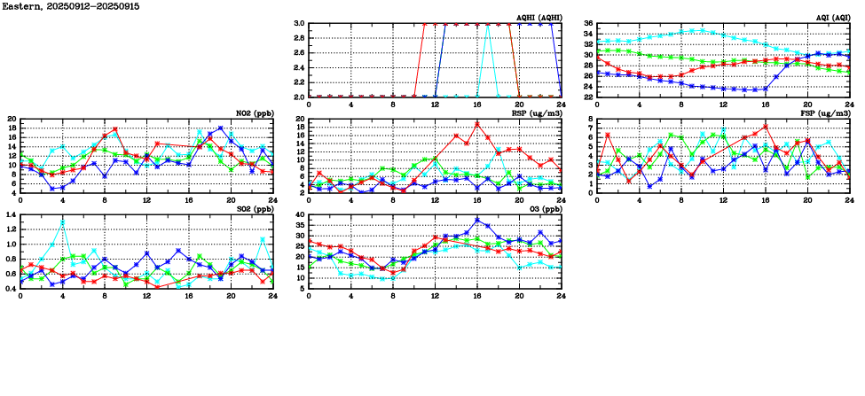 Air Quality Data Time Series in Eastern (2025/09/15) | ( Line colors: Day -3 Day -2 Day -1 Current day ) | 2D Map Current AQHI |