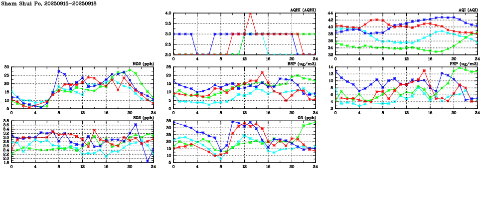 Air Quality Data Time Series in Sham Shui Po (2025/09/18) | ( Line colors: Day -3 Day -2 Day -1 Current day ) | 2D Map Current AQHI |