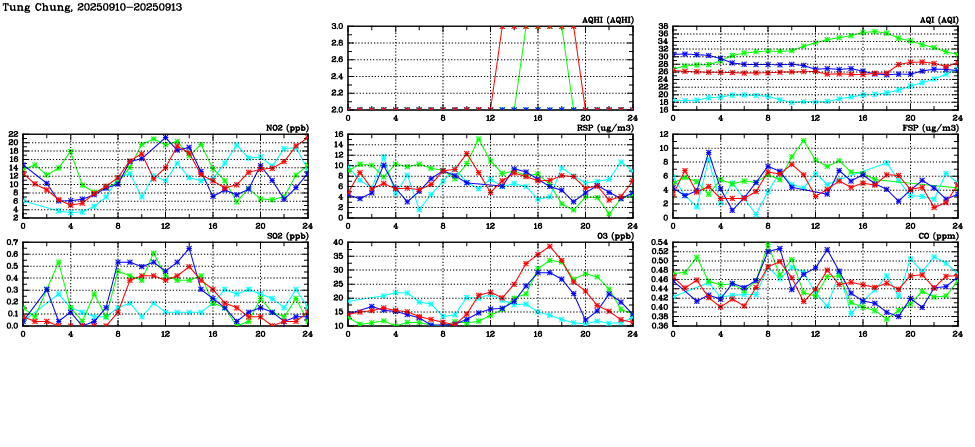 Air Quality Data Time Series in Tung Chung (2025/09/13) | ( Line colors: Day -3 Day -2 Day -1 Current day ) | 2D Map Current AQHI |