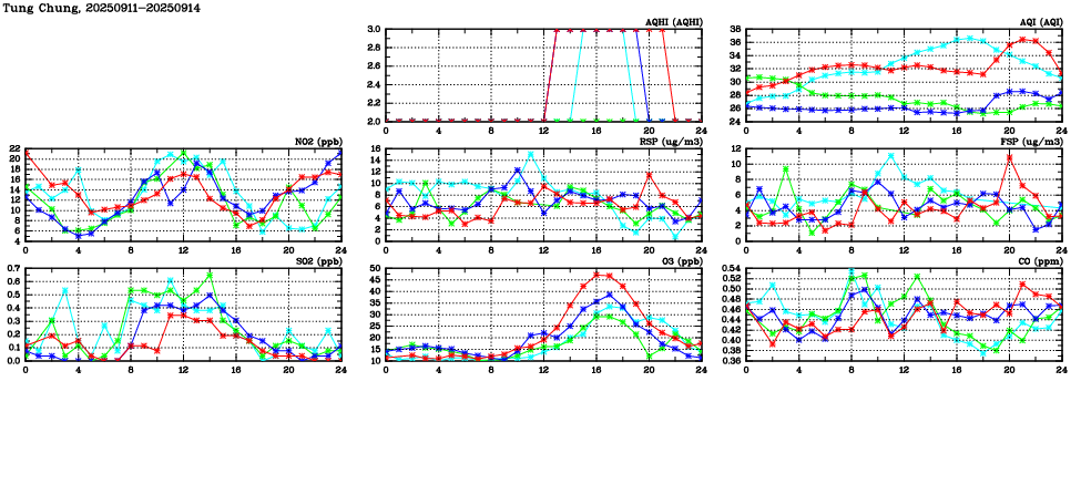 Air Quality Data Time Series in Tung Chung (2025/09/14) | ( Line colors: Day -3 Day -2 Day -1 Current day ) | 2D Map Current AQHI |