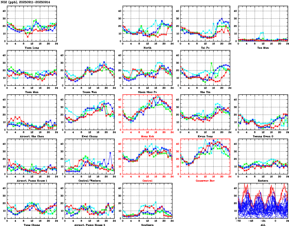 Air Quality Data Time Series for NO2 (2025/09/14) | ( Line colors: Day -3 Day -2 Day -1 Current day ) | 2D Map Current AQHI |