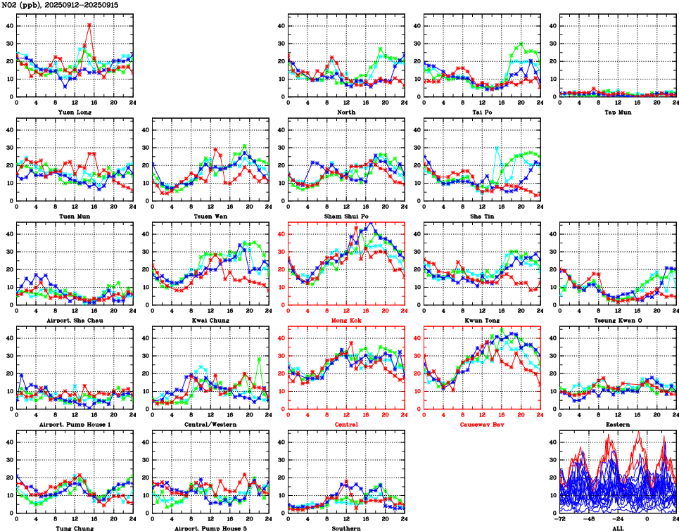 Air Quality Data Time Series for NO2 (2025/09/15) | ( Line colors: Day -3 Day -2 Day -1 Current day ) | 2D Map Current AQHI |