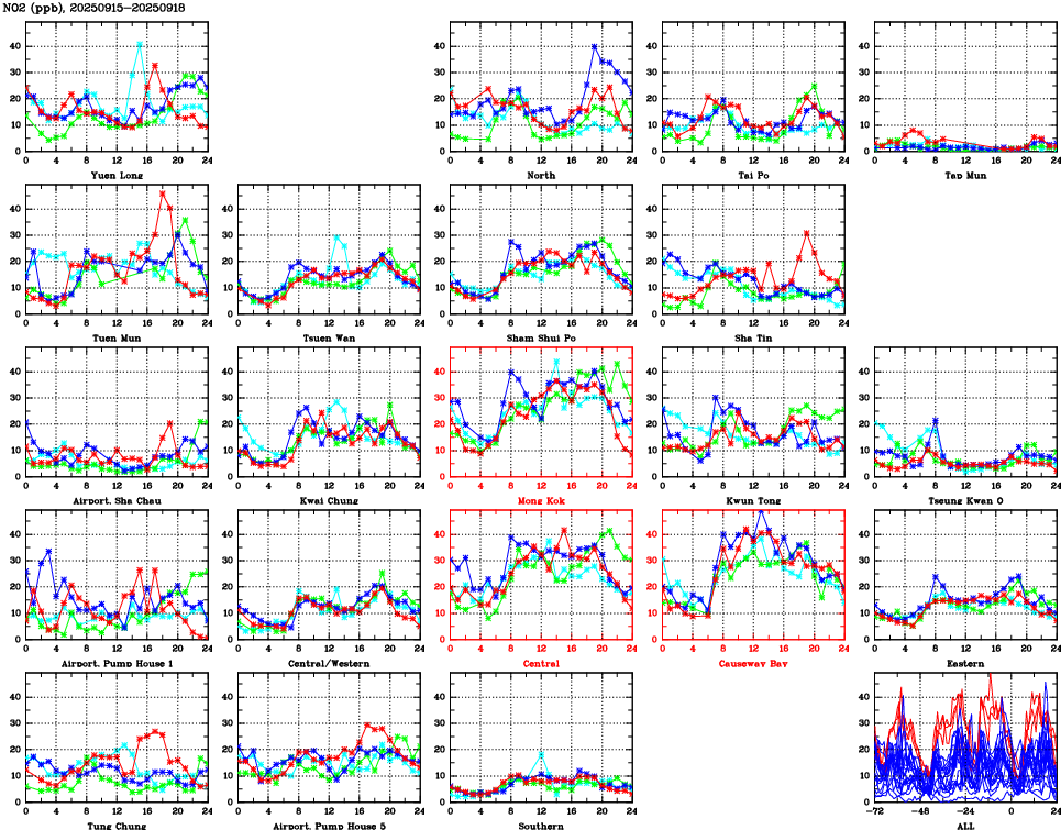 Air Quality Data Time Series for NO2 (2025/09/18) | ( Line colors: Day -3 Day -2 Day -1 Current day ) | 2D Map Current AQHI |