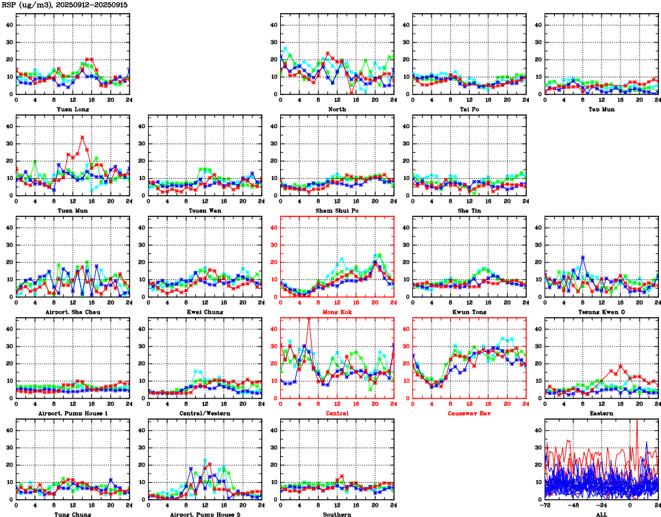 Air Quality Data Time Series for RSP (2025/09/15) | ( Line colors: Day -3 Day -2 Day -1 Current day ) | 2D Map Current AQHI |