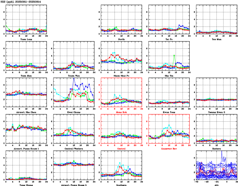 Air Quality Data Time Series for SO2 (2025/09/14) | ( Line colors: Day -3 Day -2 Day -1 Current day ) | 2D Map Current AQHI |