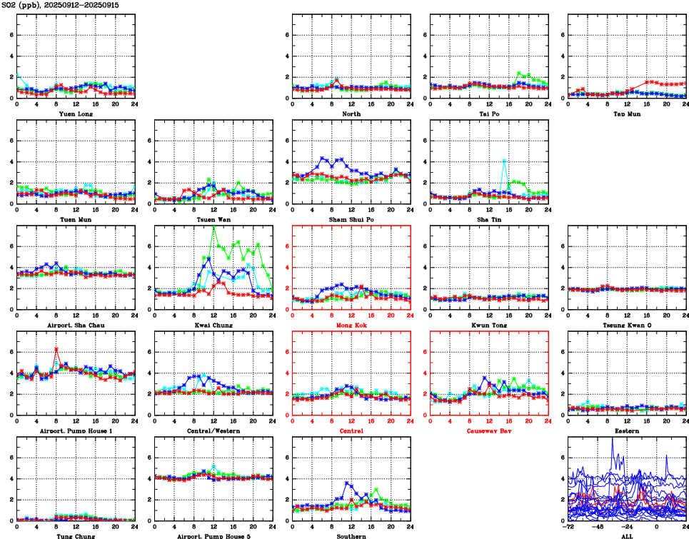 Air Quality Data Time Series for SO2 (2025/09/15) | ( Line colors: Day -3 Day -2 Day -1 Current day ) | 2D Map Current AQHI |