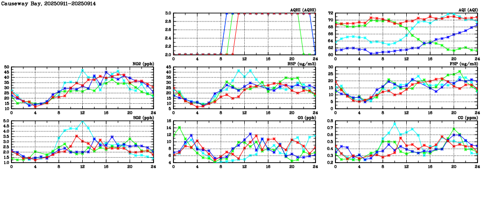Air Quality Data Time Series in Causeway Bay (2025/09/14) | ( Line colors: Day -3 Day -2 Day -1 Current day ) | 2D Map Current AQHI |