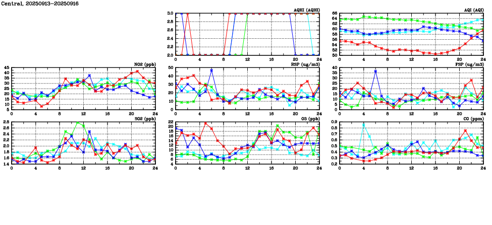 Air Quality Data Time Series in Central (2025/09/16) | ( Line colors: Day -3 Day -2 Day -1 Current day ) | 2D Map Current AQHI |