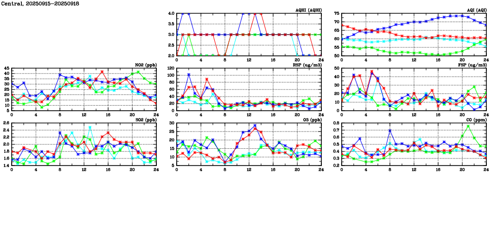 Air Quality Data Time Series in Central (2025/09/18) | ( Line colors: Day -3 Day -2 Day -1 Current day ) | 2D Map Current AQHI |