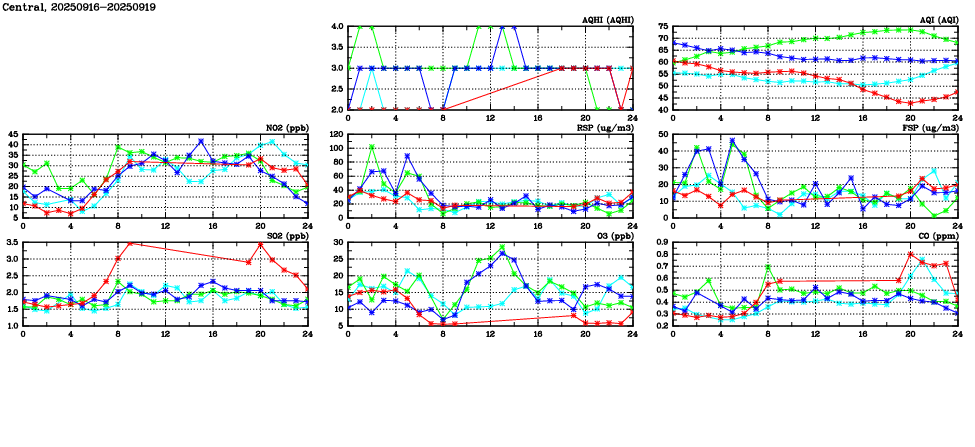Air Quality Data Time Series in Central (2025/09/19) | ( Line colors: Day -3 Day -2 Day -1 Current day ) | 2D Map Current AQHI |