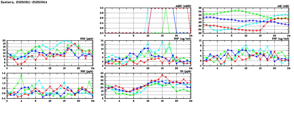 Air Quality Data Time Series in Eastern (2025/09/14) | ( Line colors: Day -3 Day -2 Day -1 Current day ) | 2D Map Current AQHI |