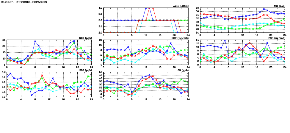 Air Quality Data Time Series in Eastern (2025/09/18) | ( Line colors: Day -3 Day -2 Day -1 Current day ) | 2D Map Current AQHI |