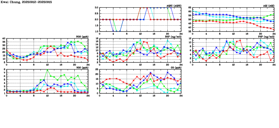 Air Quality Data Time Series in Kwai Chung (2025/09/15) | ( Line colors: Day -3 Day -2 Day -1 Current day ) | 2D Map Current AQHI |