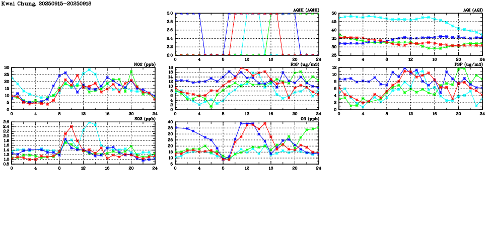 Air Quality Data Time Series in Kwai Chung (2025/09/18) | ( Line colors: Day -3 Day -2 Day -1 Current day ) | 2D Map Current AQHI |