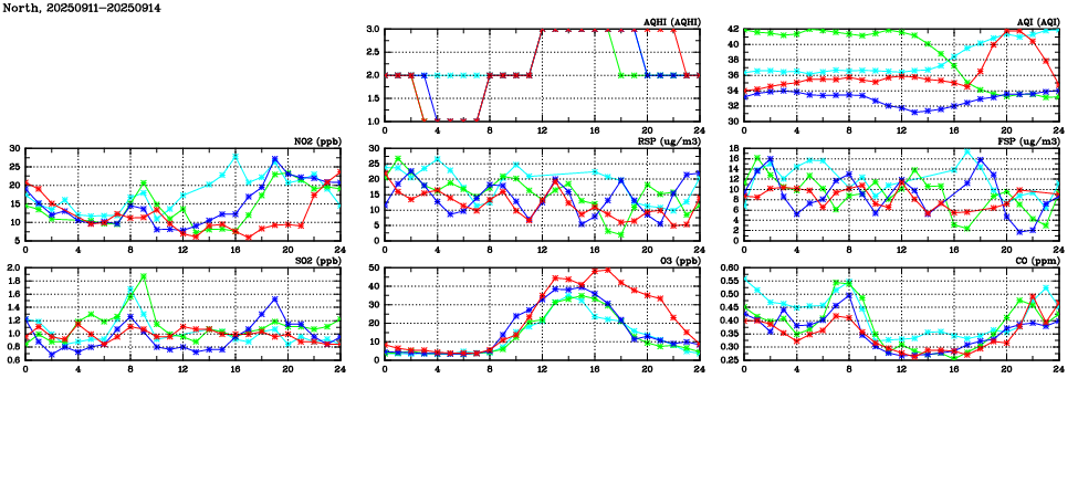 Air Quality Data Time Series in North (2025/09/14) | ( Line colors: Day -3 Day -2 Day -1 Current day ) | 2D Map Current AQHI |