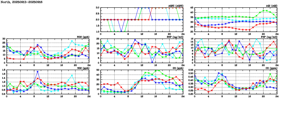 Air Quality Data Time Series in North (2025/09/16) | ( Line colors: Day -3 Day -2 Day -1 Current day ) | 2D Map Current AQHI |