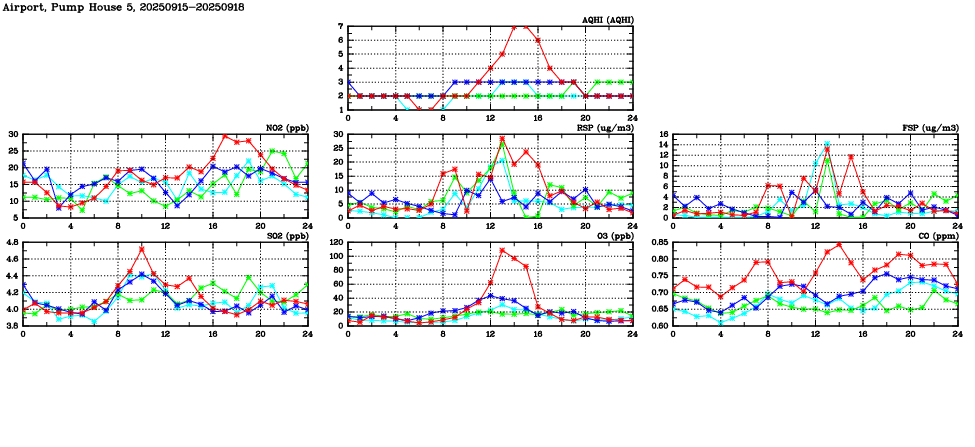 Air Quality Data Time Series in Airport, Pump House 5 (2025/09/18) | ( Line colors: Day -3 Day -2 Day -1 Current day ) | 2D Map Current AQHI |