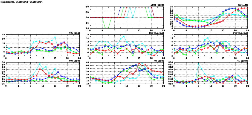 Air Quality Data Time Series in Southern (2025/09/14) | ( Line colors: Day -3 Day -2 Day -1 Current day ) | 2D Map Current AQHI |