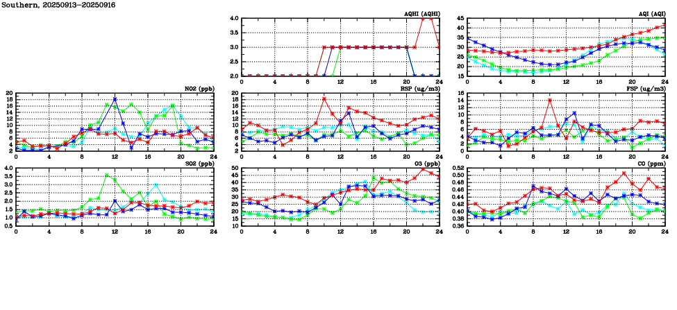 Air Quality Data Time Series in Southern (2025/09/16) | ( Line colors: Day -3 Day -2 Day -1 Current day ) | 2D Map Current AQHI |