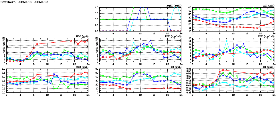 Air Quality Data Time Series in Southern (2025/09/19) | ( Line colors: Day -3 Day -2 Day -1 Current day ) | 2D Map Current AQHI |