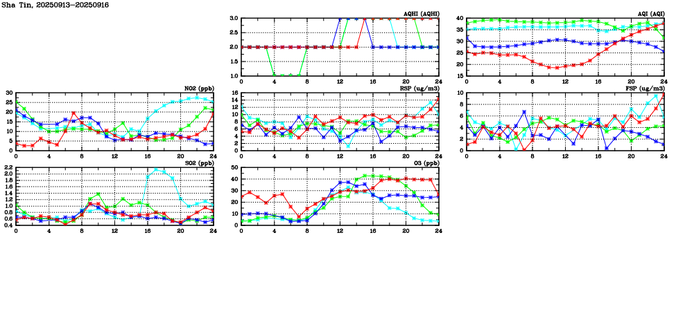 Air Quality Data Time Series in Sha Tin (2025/09/16) | ( Line colors: Day -3 Day -2 Day -1 Current day ) | 2D Map Current AQHI |