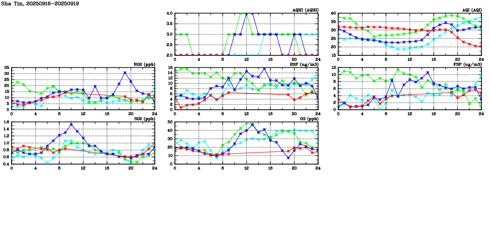 Air Quality Data Time Series in Sha Tin (2025/09/19) | ( Line colors: Day -3 Day -2 Day -1 Current day ) | 2D Map Current AQHI |