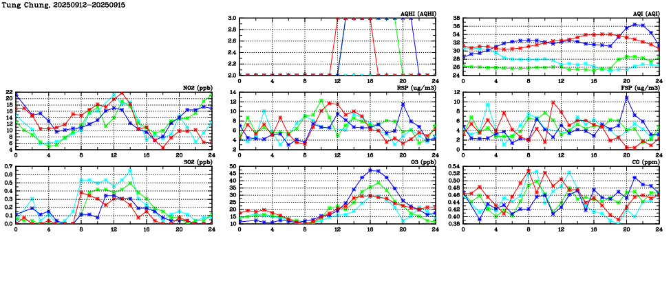 Air Quality Data Time Series in Tung Chung (2025/09/15) | ( Line colors: Day -3 Day -2 Day -1 Current day ) | 2D Map Current AQHI |