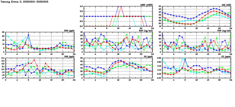 Air Quality Data Time Series in Tseung Kwan O (2025/09/18) | ( Line colors: Day -3 Day -2 Day -1 Current day ) | 2D Map Current AQHI |