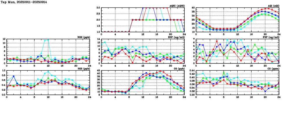 Air Quality Data Time Series in Tap Mun (2025/09/14) | ( Line colors: Day -3 Day -2 Day -1 Current day ) | 2D Map Current AQHI |