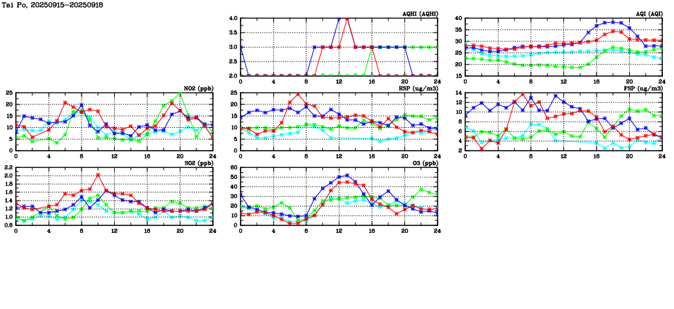 Air Quality Data Time Series in Tai Po (2025/09/18) | ( Line colors: Day -3 Day -2 Day -1 Current day ) | 2D Map Current AQHI |