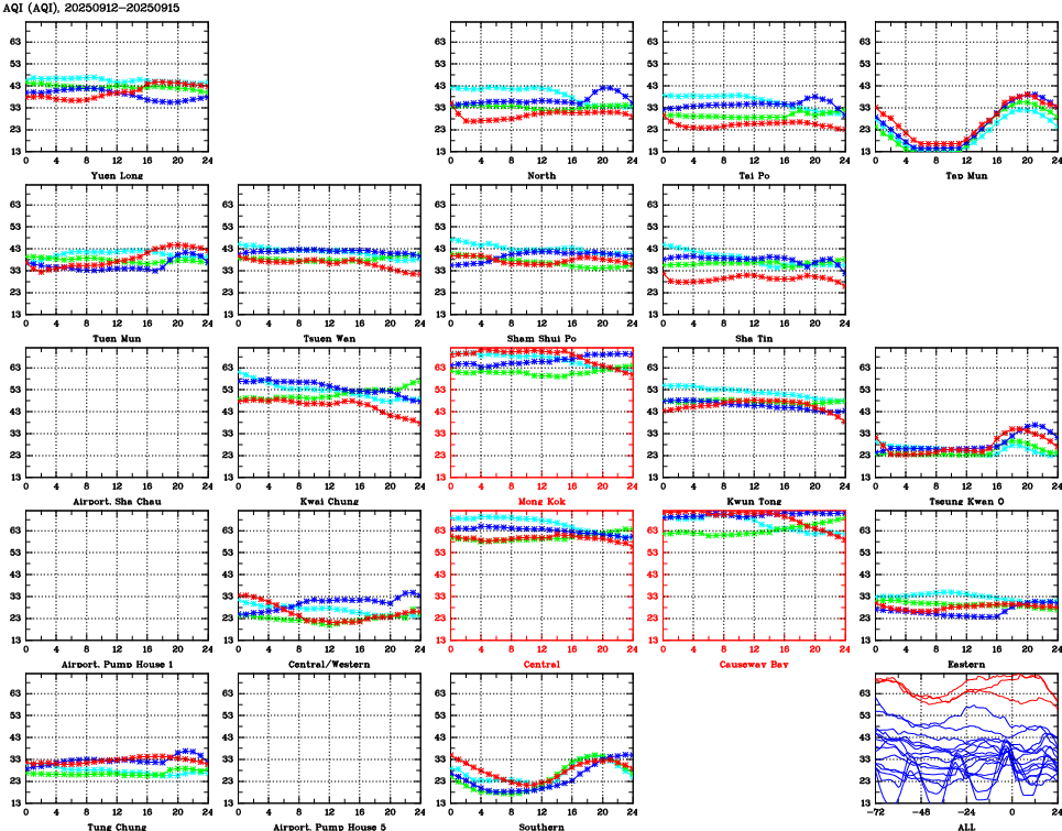 Air Quality Data Time Series for AQI (2025/09/15) | ( Line colors: Day -3 Day -2 Day -1 Current day ) | 2D Map Current AQHI |