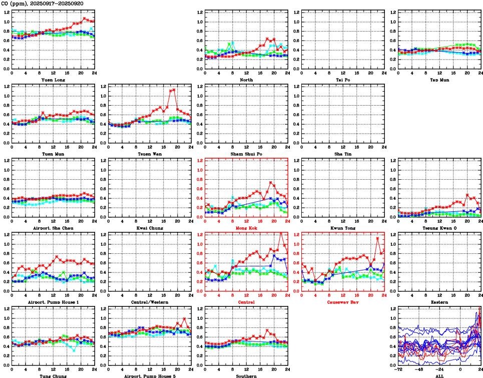 Air Quality Data Time Series for CO (2025/09/20) | ( Line colors: Day -3 Day -2 Day -1 Current day ) | 2D Map Current AQHI |