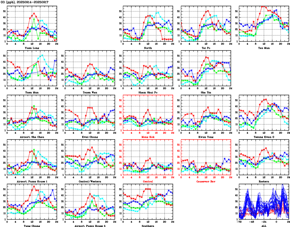 Air Quality Data Time Series for O3 (2025/09/17) | ( Line colors: Day -3 Day -2 Day -1 Current day ) | 2D Map Current AQHI |