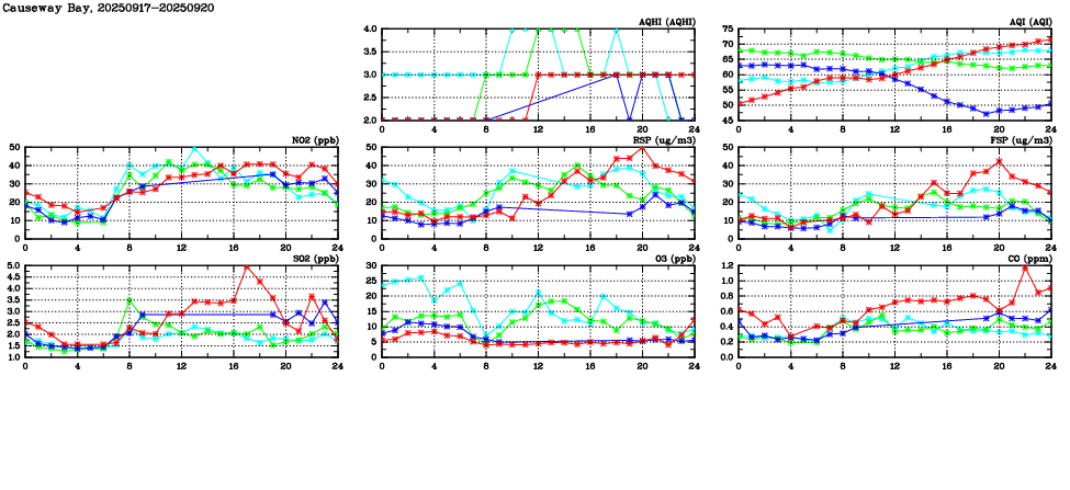 Air Quality Data Time Series in Causeway Bay (2025/09/20) | ( Line colors: Day -3 Day -2 Day -1 Current day ) | 2D Map Current AQHI |
