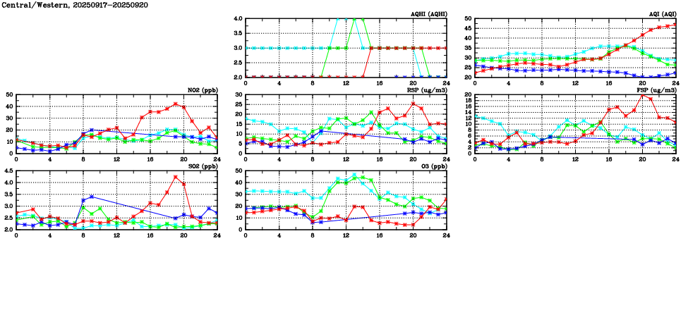 Air Quality Data Time Series in Central/Western (2025/09/20) | ( Line colors: Day -3 Day -2 Day -1 Current day ) | 2D Map Current AQHI |