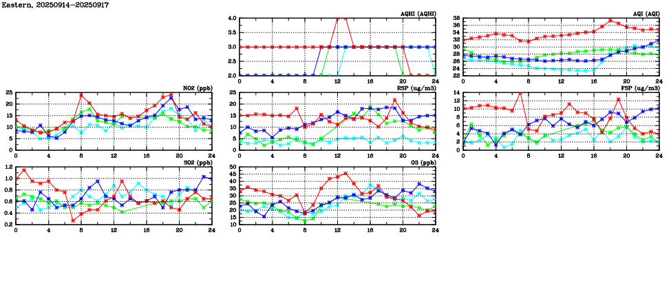 Air Quality Data Time Series in Eastern (2025/09/17) | ( Line colors: Day -3 Day -2 Day -1 Current day ) | 2D Map Current AQHI |