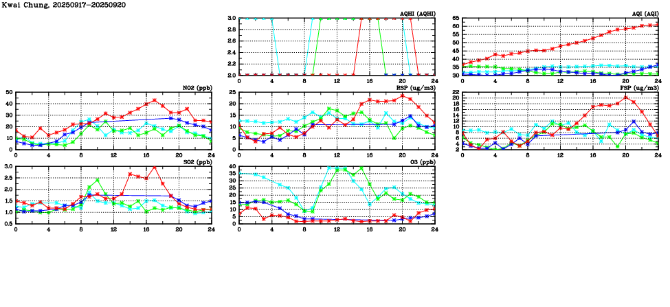 Air Quality Data Time Series in Kwai Chung (2025/09/20) | ( Line colors: Day -3 Day -2 Day -1 Current day ) | 2D Map Current AQHI |