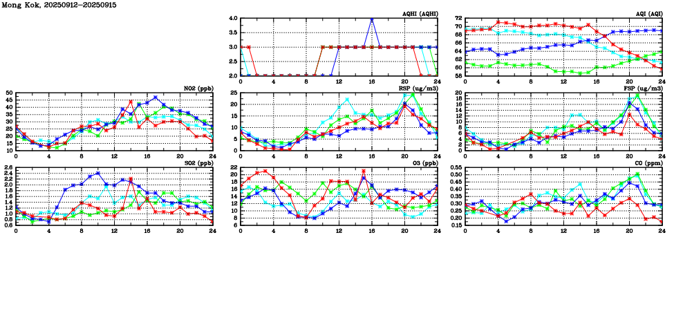 Parameters: | AQHI | AQI | RSP | FSP | NO2 | SO2 | O3 | CO | Temp | WS | WD |