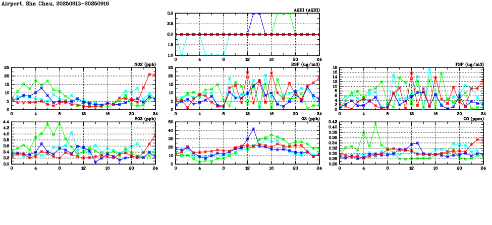 Air Quality Data Time Series in Airport, Sha Chau (2025/09/16) | ( Line colors: Day -3 Day -2 Day -1 Current day ) | 2D Map Current AQHI |