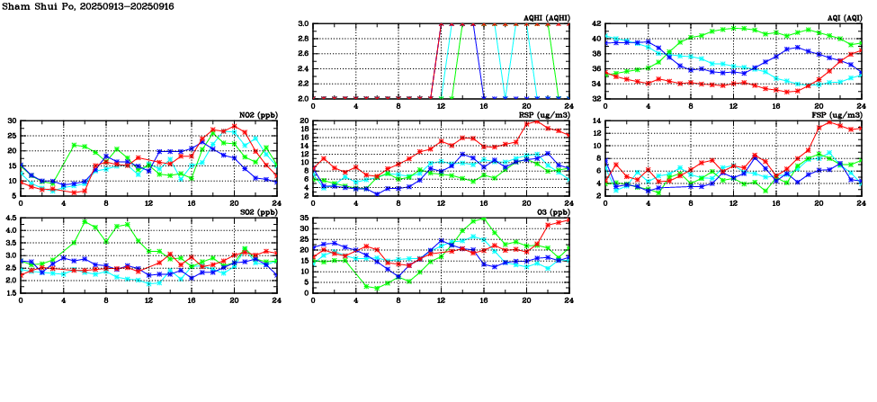 Air Quality Data Time Series in Sham Shui Po (2025/09/16) | ( Line colors: Day -3 Day -2 Day -1 Current day ) | 2D Map Current AQHI |