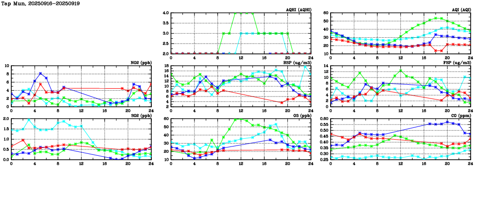 Parameters: | AQHI | AQI | RSP | FSP | NO2 | SO2 | O3 | CO | Temp | WS | WD |